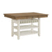 Transform your dining space with the Bellevue Counter Height Dining Set. Constructed of rubberwood and MDF with oak veneer, the table features a two-tone design. Distressed edges throughout every piece elevates the farmhouse chic look that this group delivers. Included in the table base is storage galore with wine bottle compartments, shelves, and felt-lined drawers. The counter chairs have a slat back design and feature a foam cushion upholstered seat for comfort and stretchers for added stability . Upgrade your dining experience today with the Bellevue collection pieces.