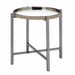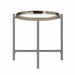 The Edith Round End Table is the perfect addition to your home! This end table features a mirrored table top, that is also tray like; so everything will stay on the table and not fall off! The table top edge is finished in a gold, while the legs are in a dark nickel. The base of the table features stretchers that cross at the bottom providing extra support without losing style! This end table is super stylish and ideal for small space living!