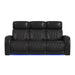 Upgrade your living room’s décor with the Prime Time Sofa. The power recline, headrest, and lumbar functions maximize comfort, allowing you to enhance your moments of repose. Features like LED lighting and a drop-down table with reading lights add modern flair, while wireless charging, metal cupholders, and hidden storage in the armrests add practical convenience. Luxurious 100% leather upholstery in a versatile black finish makes this piece easy to pair with various décor styles, and supportive pocket coil seating with foam cushioning creates a cozy retreat. For a refined addition of style and comfort, the Prime Time Sofa delivers.