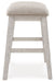 This upholstered stool invites you to raise the bar on small space living. An inspired choice for coastal chic or modern farmhouse settings, this comfortably cushioned stool sports a grayish white finish with rub-through effect for timeworn appeal.